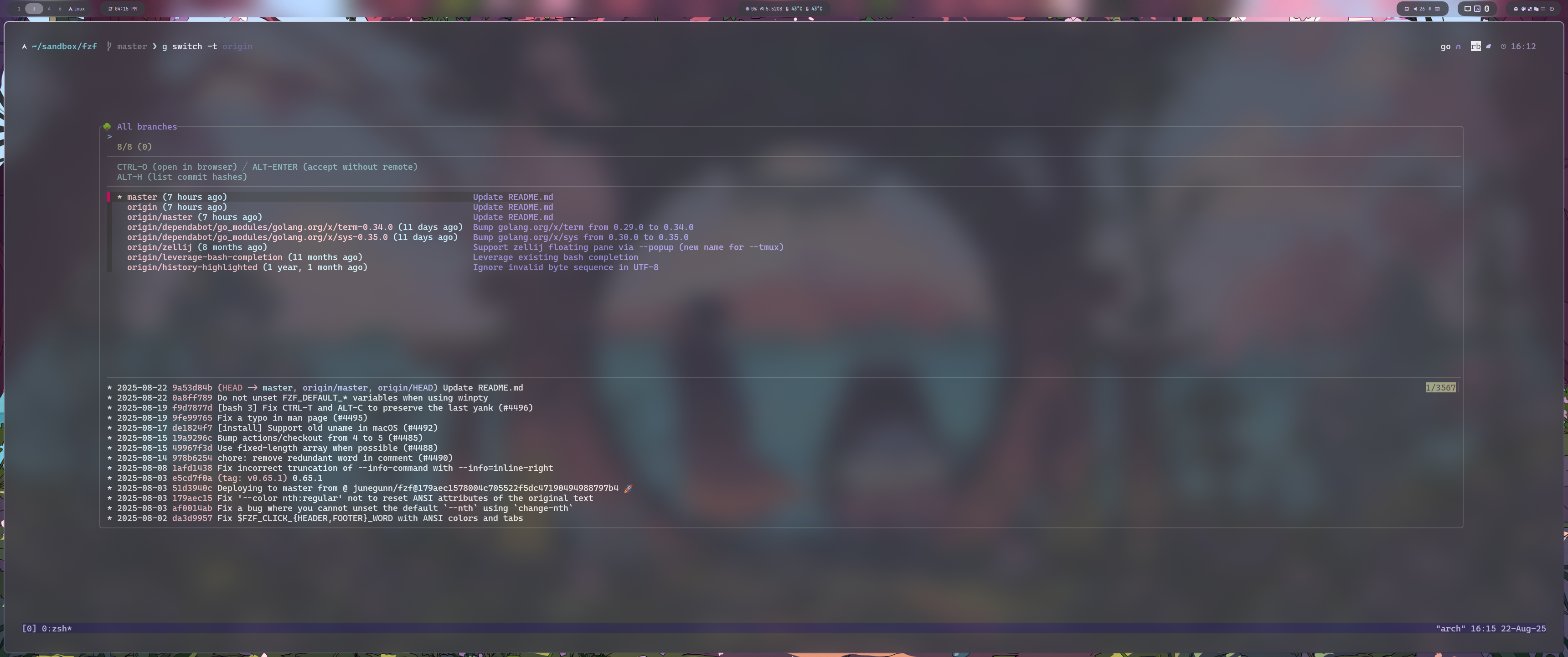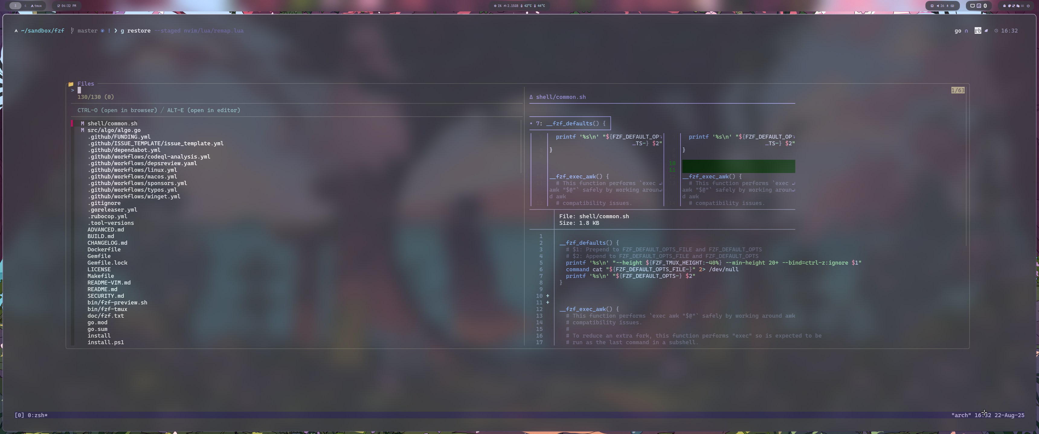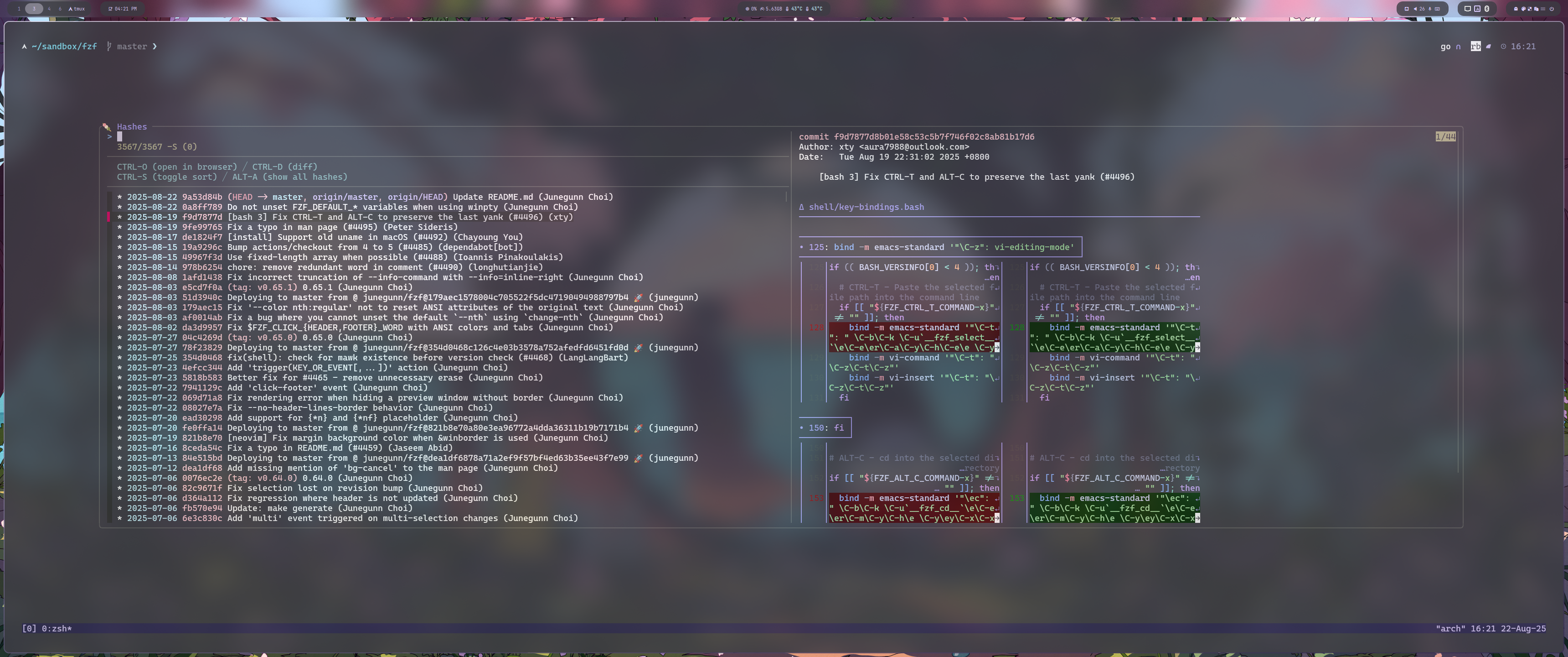 This is by far the most useful feature, diffing between commits, cherry picking commits, looking at diffs for various commits, and a ton more are made super easy with this. You can fuzzy find by commit message, and the hash is output with this command, so instead of tracking down commit hashes and copy pasting them to the diff command, you can just do